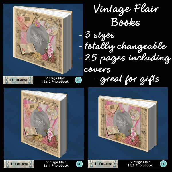 AND 'Vintage Flair Books'. Come see all the beautiful premade pages that are totally changeable to your needs. These books would make beautiful gifts or wonderful coffee table books.